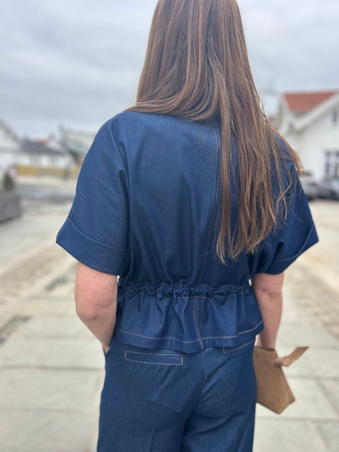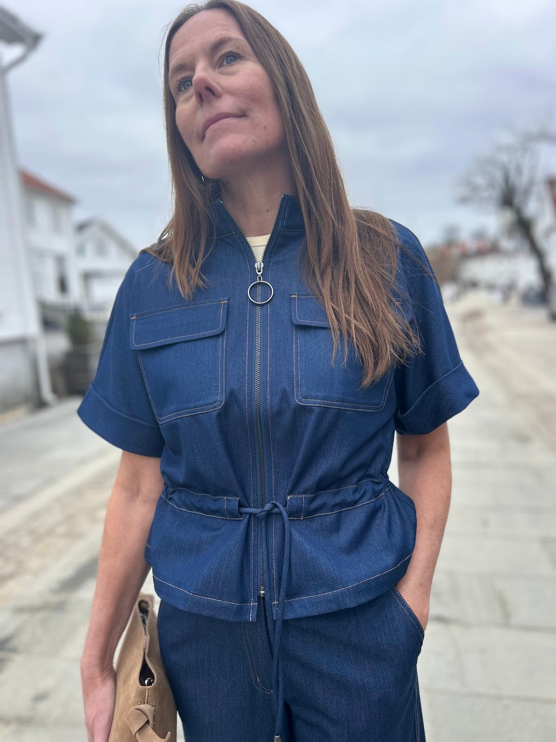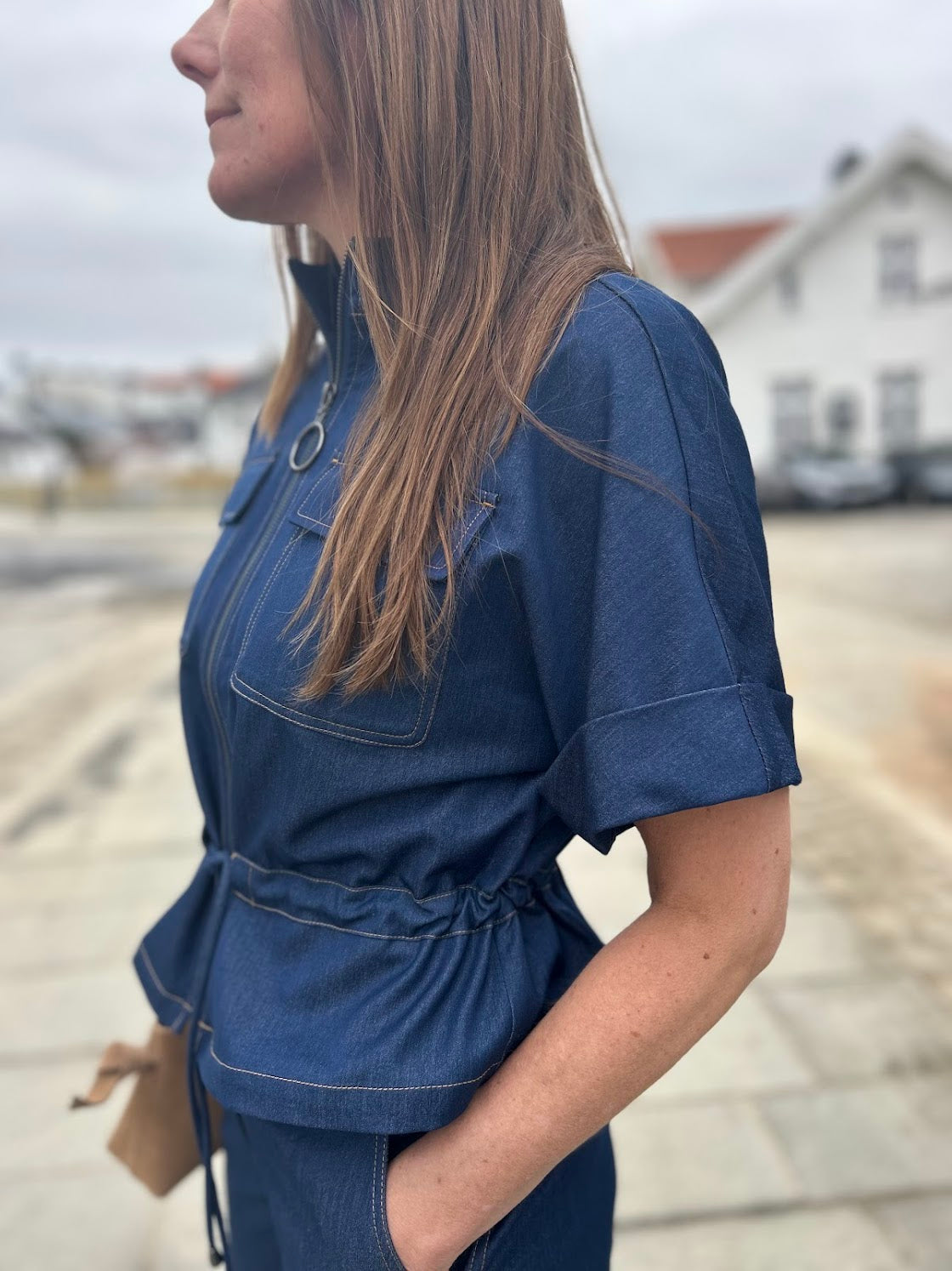 Kul vest i myk denim. Vesten har glidelås og lommer i front, knyting i livet og halvlange ermer. Kult it-plagg til garderoben din, med mange stylingmuligheter. Så kul i sett med Terry bukser!