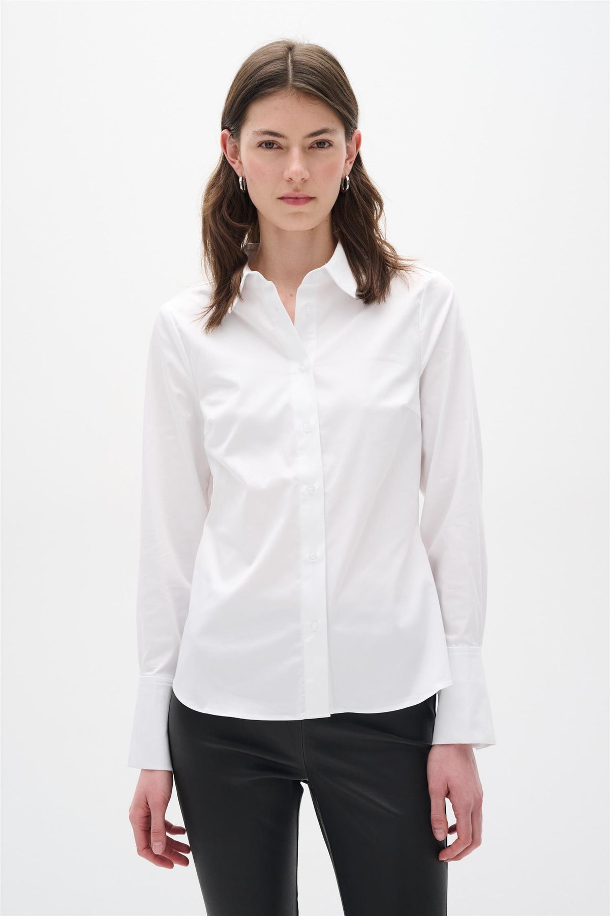 Den klassiske hvite skjorten. Den har en rett smal passform og smale ermer med lang mansjett, som gjør at du enkelt kan brette opp ermene uten for mye jobb. Den er litt avrundet og lenger bak som gir en flatterende passform.