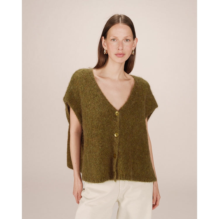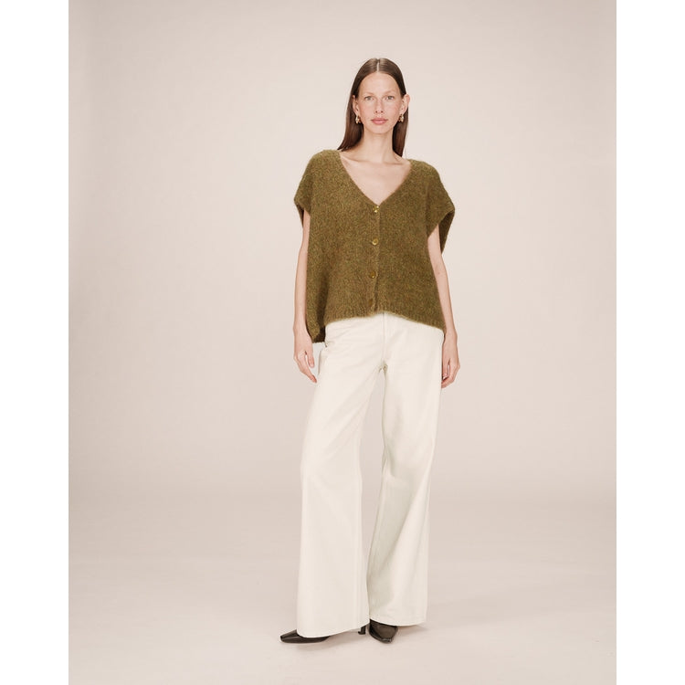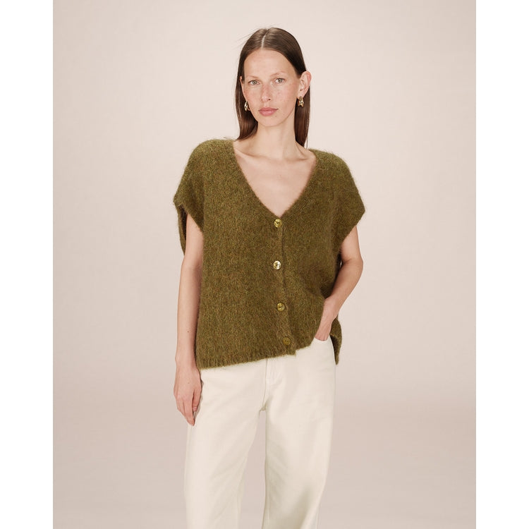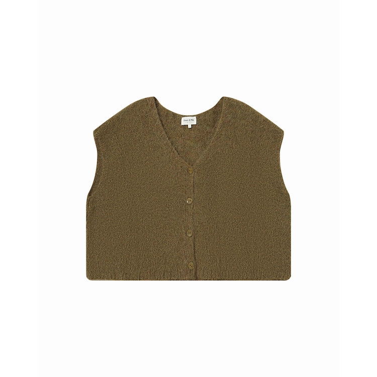 En myk og behagelig vest strikket i en luksuriøs blanding av alpakka, ull og viskose. Den er ermeløs med en avslappet passform, V-hals og knappelukking foran – perfekt for lag-på-lag og et uanstrengt, elegant uttrykk.