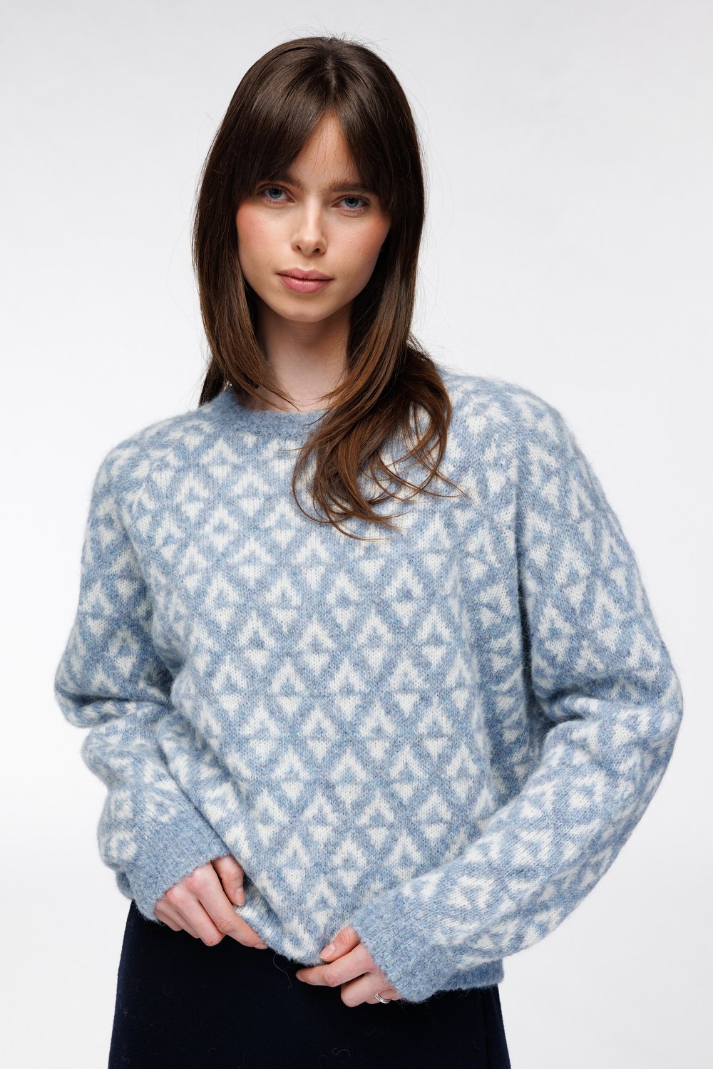 Myk og varm genser med rund hals og klassisk nordisk mønster i lyseblått og hvitt. Strikket i en lett og lodden ullblanding for en komfortabel og tidløs stil.