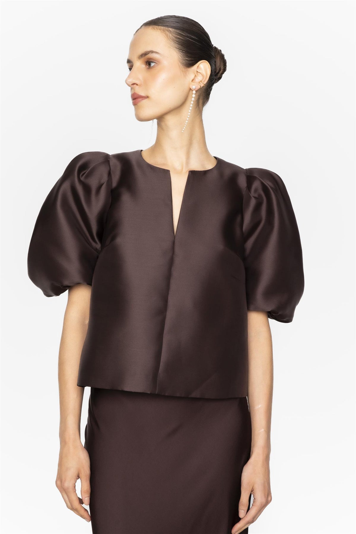 Løstsittende bluse med en smal V-hals og voluminøse ermer som går rett over albuen. Uanstrengt stilig og komfortabel, perfekt for både avslappet og pent antrekk.