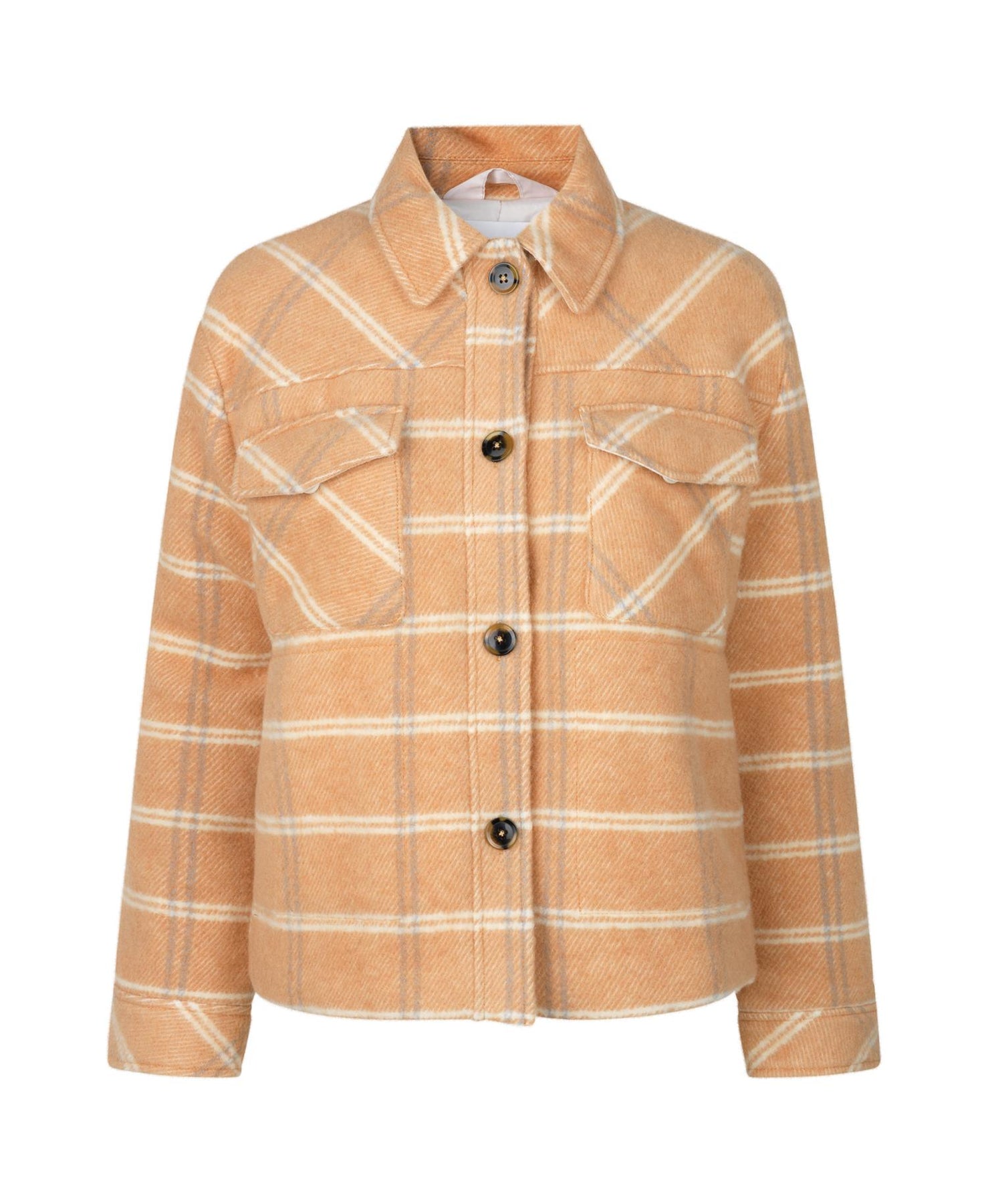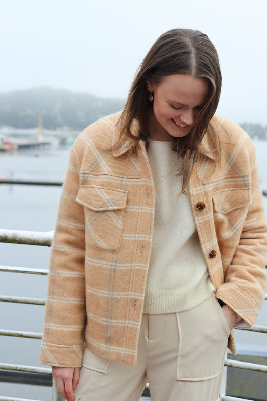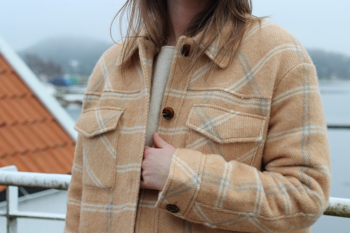 Trendy, kul skjortejakke fra Samsøe i et herlig check-print. Jakken har store brystlommer, kontrastknapper og krage.