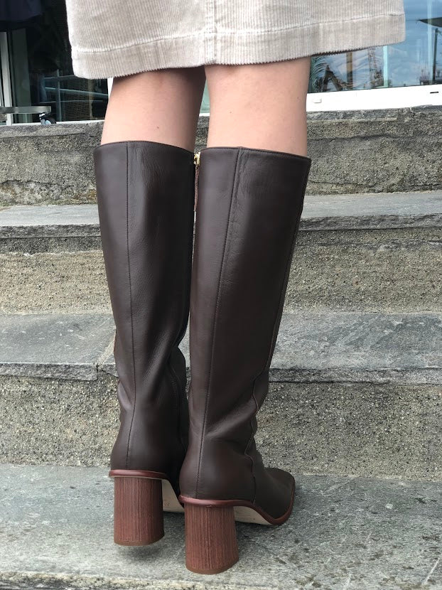 En lekker støvlett med høyt skaft som skiller seg ut med sin rette tupp og block hæl.