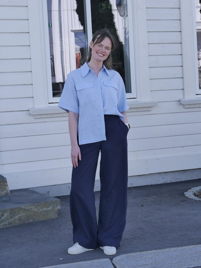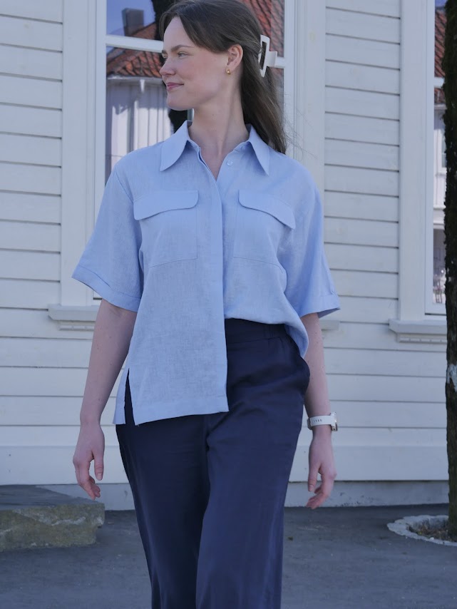 Linskjorte fra Norr. Kul, boxy fit, med korte ermer og to store klafflommer i front. Skjult knappestolpe. Skjorten har splitter i siden som gir en nettere og fasong.